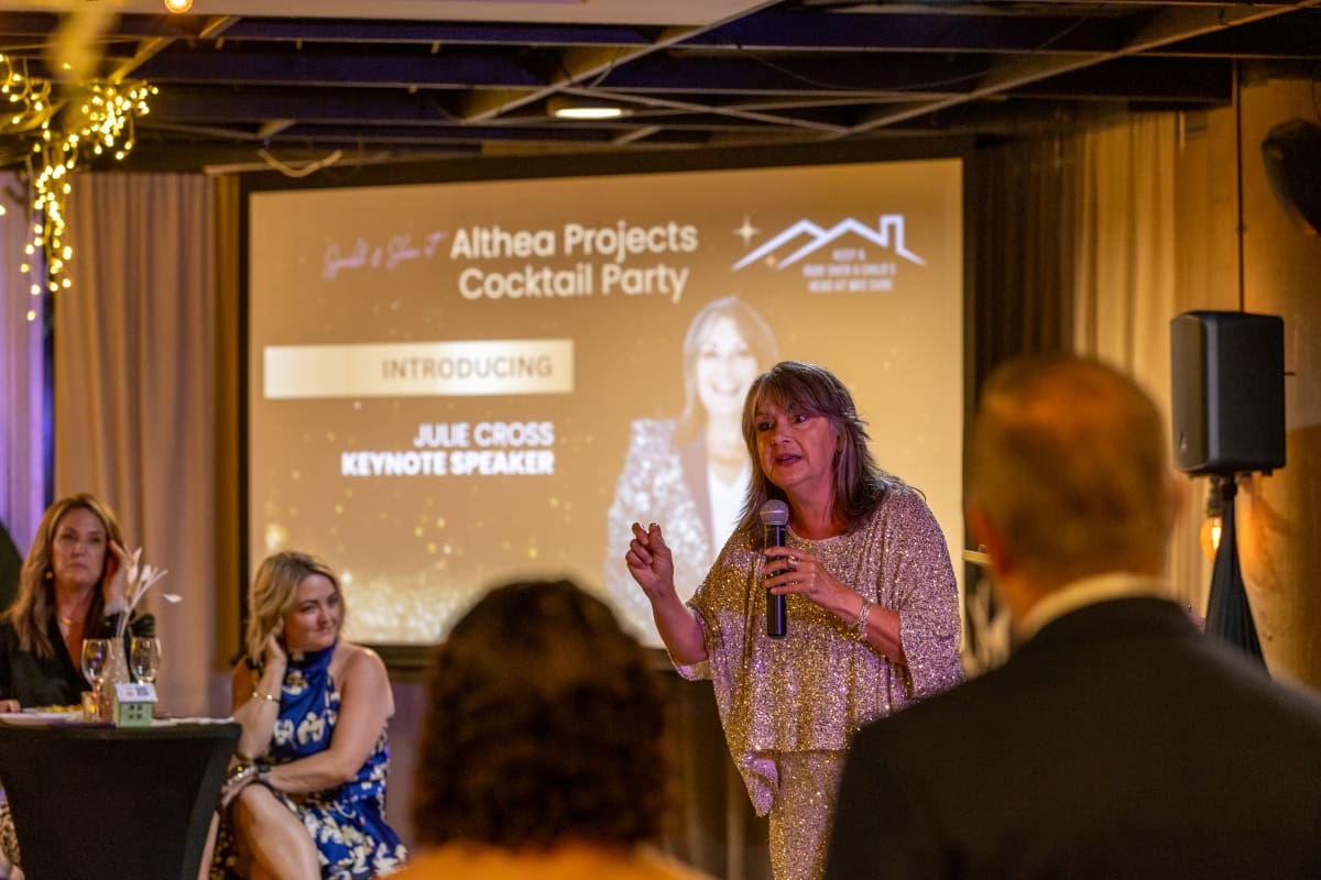 In July 2025 Althea Projects held a Cocktail Party to raise funds to replace the roof at Wee Care. The Cocktail Party was held at Allure Events with over 140 people in attendance. The theme of the evening was ‘Sparkle & Shine’ with keynote speaker Julie Cross delivering an impactful message full of fun and laughter alongside heartfelt insights.